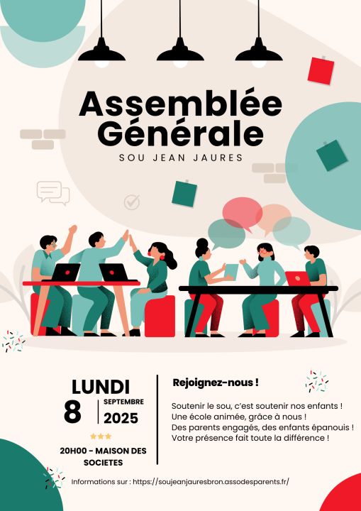 Le Sou des écoles a le plaisir de vous inviter à sa prochaine réunion qui se tiendra le lundi 22 septembre à 20h00 - maison des sociétés de Bron.